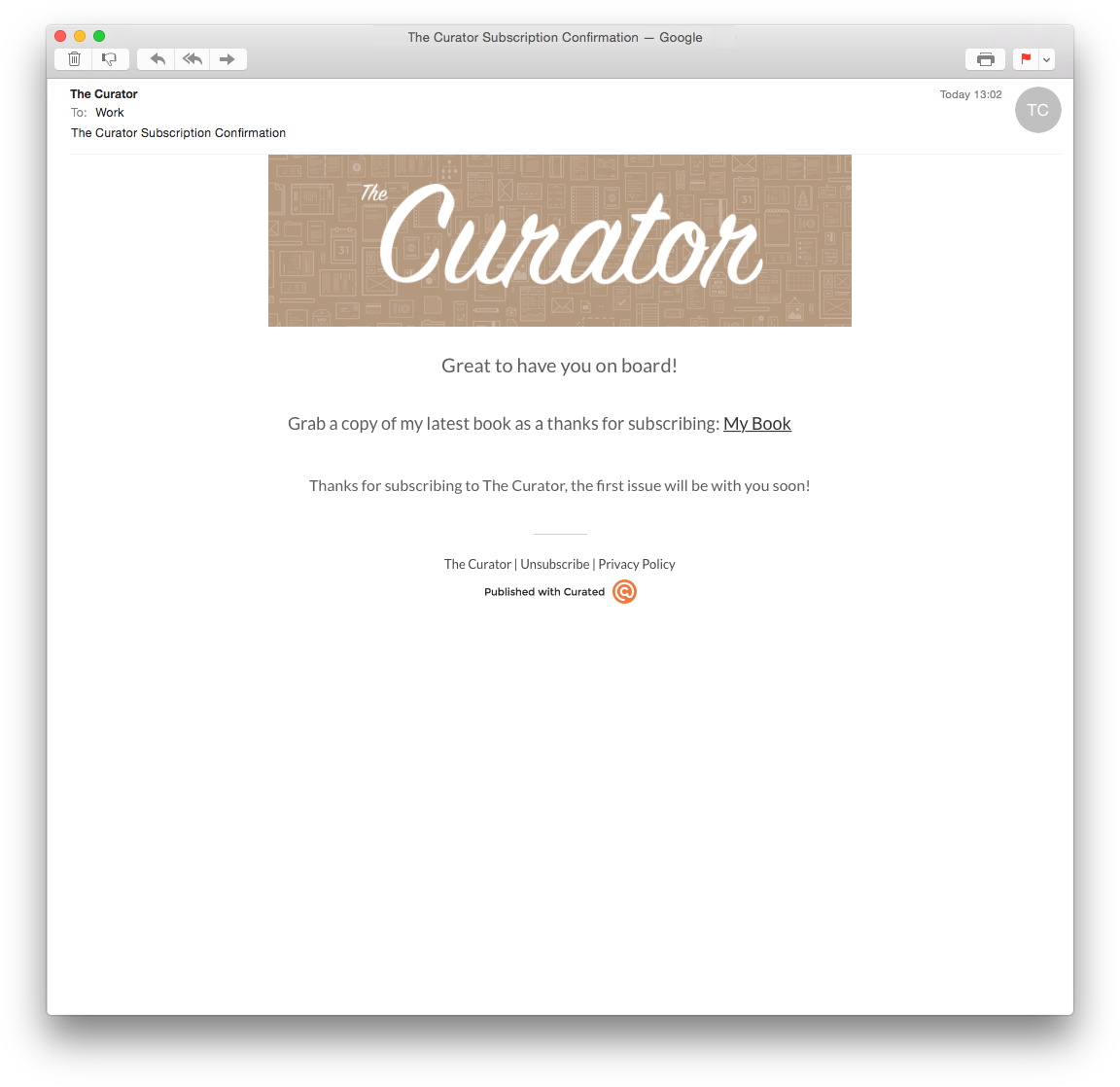 If you would prefer new subscribers to see a completely custom page instead of a simple welcome message, you can configure Curated to redirect new subscribers to a page on your own website instead.